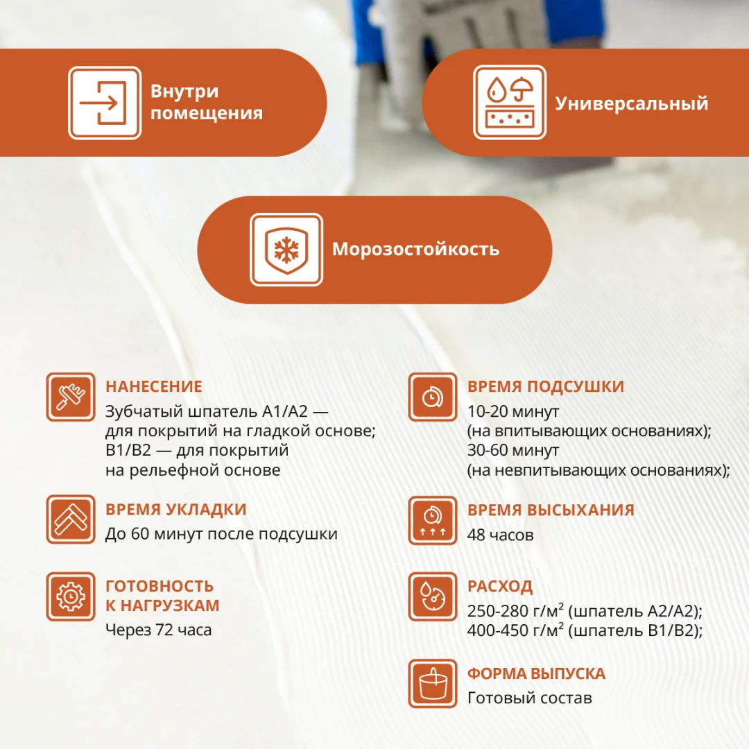 - Расход250-280г/м2 (шпатель А1/А2), 400-450г/м2 (шпатель В1/В2)