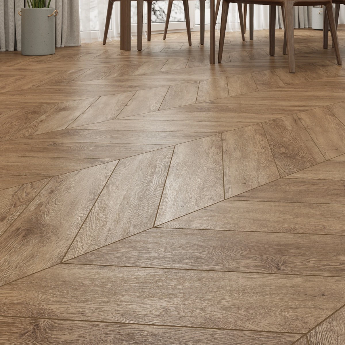 С фаской 4V: срез по всем четырём краям каждой панели создаёт V-образные канавки. Это придаёт покрытию натуральный вид доски и скрывает мелкие неровности основания. Подходит для помещений с интенсивным использованием.