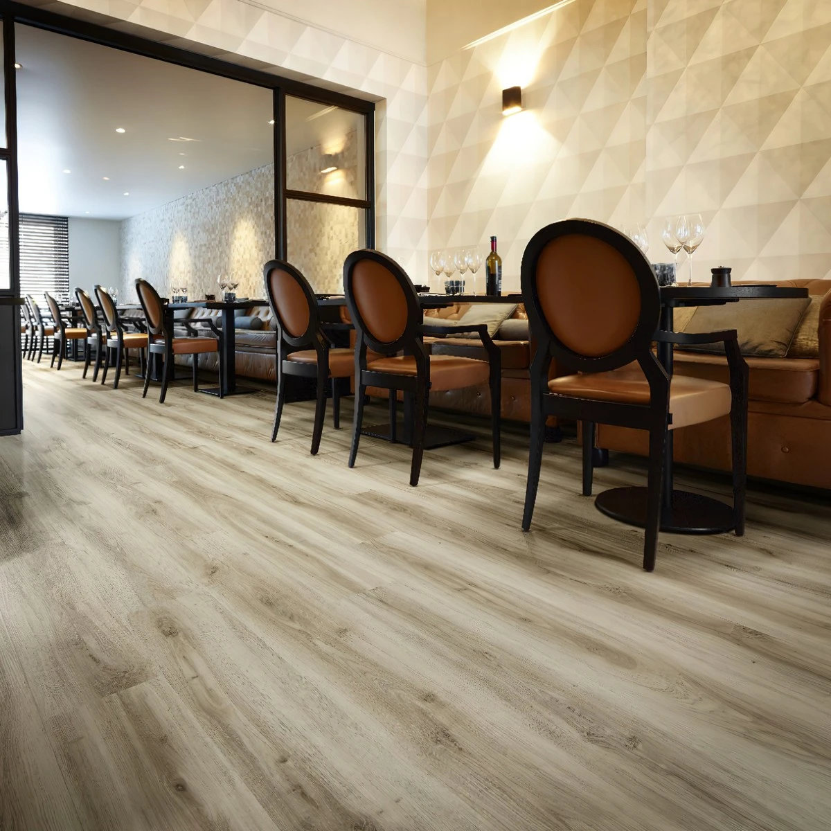 С фаской 4V: срез по всем четырём краям каждой панели создаёт V-образные канавки. Это придаёт покрытию натуральный вид доски и скрывает мелкие неровности основания. Подходит для помещений с интенсивным использованием.