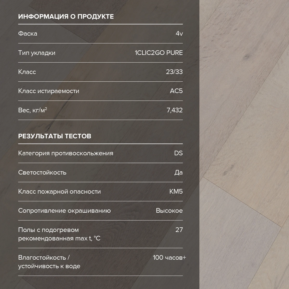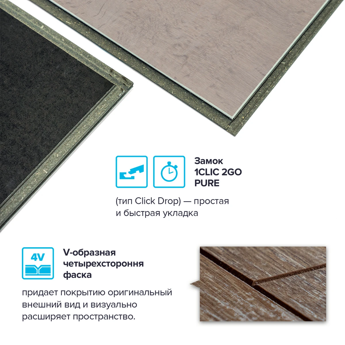 С фаской 4V: срез по всем четырём краям каждой панели создаёт V-образные канавки. Это придаёт покрытию натуральный вид доски и скрывает мелкие неровности основания. Подходит для помещений с интенсивным использованием.