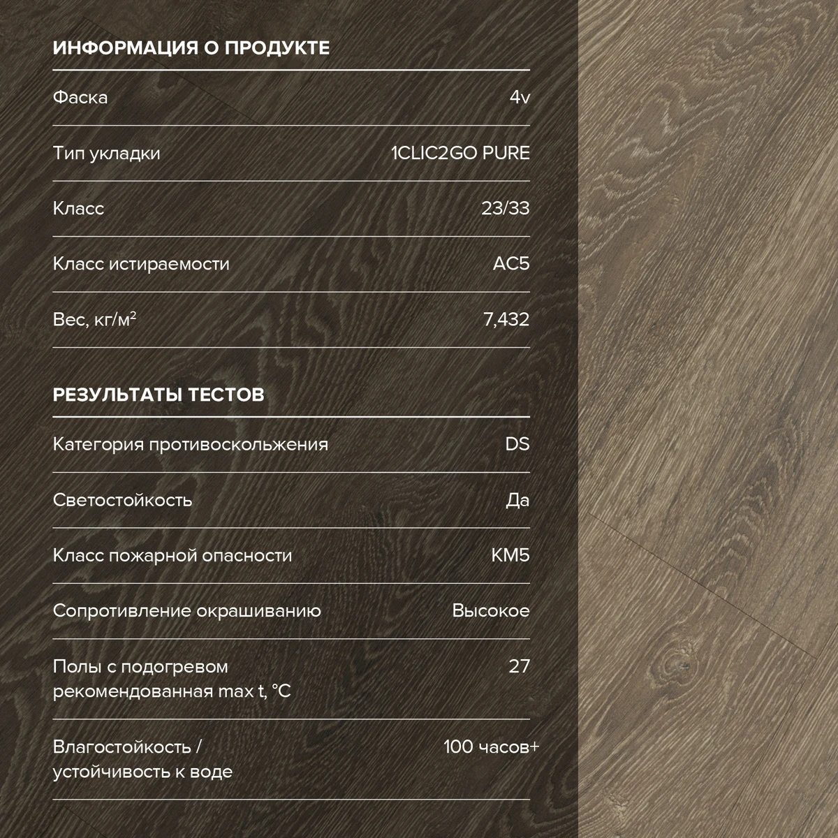 С фаской 4V: срез по всем четырём краям каждой панели создаёт V-образные канавки. Это придаёт покрытию натуральный вид доски и скрывает мелкие неровности основания. Подходит для помещений с интенсивным использованием.