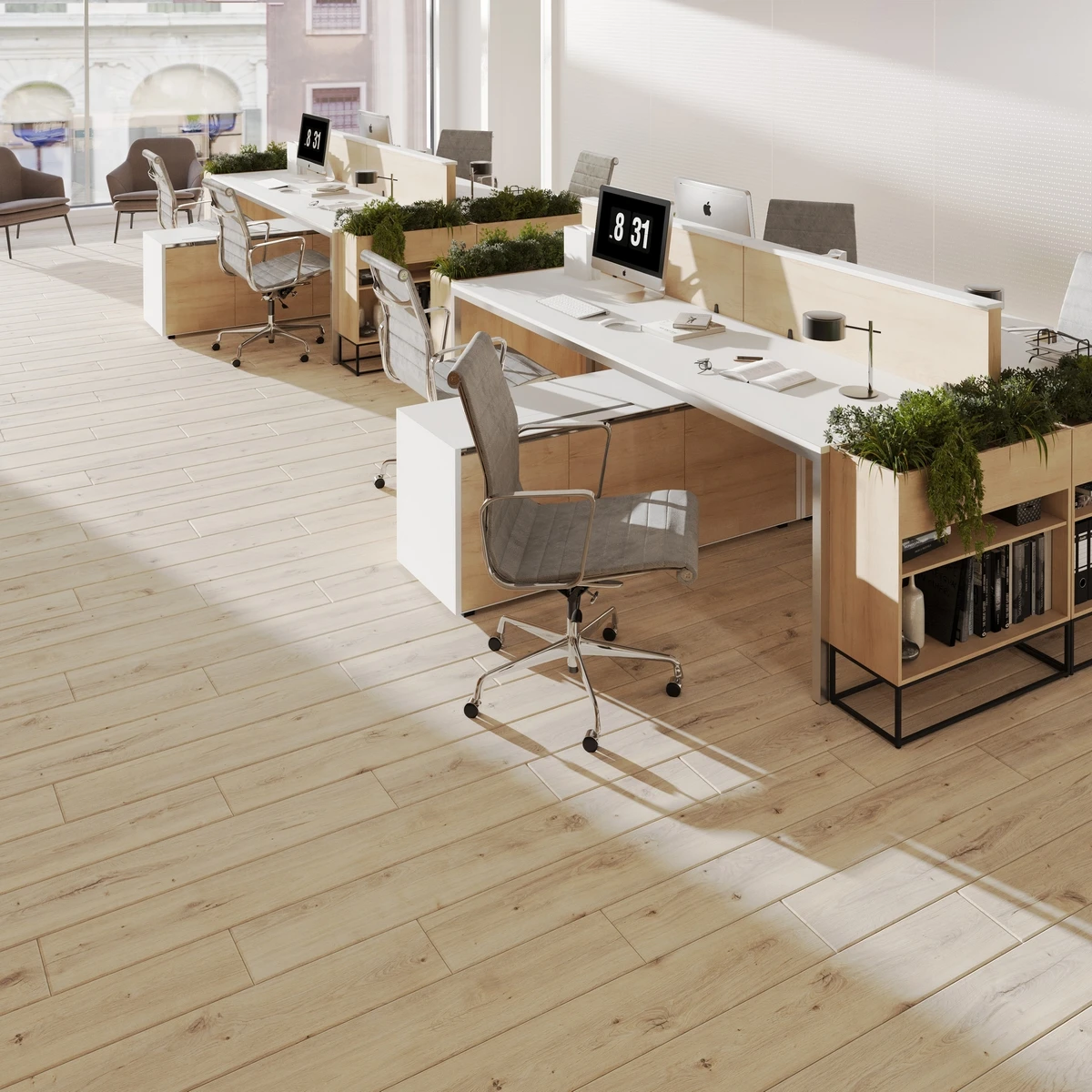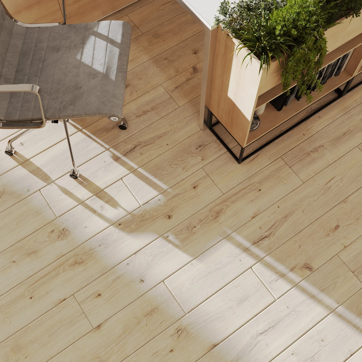 С фаской 4V: срез по всем четырём краям каждой панели создаёт V-образные канавки. Это придаёт покрытию натуральный вид доски и скрывает мелкие неровности основания. Подходит для помещений с интенсивным использованием.