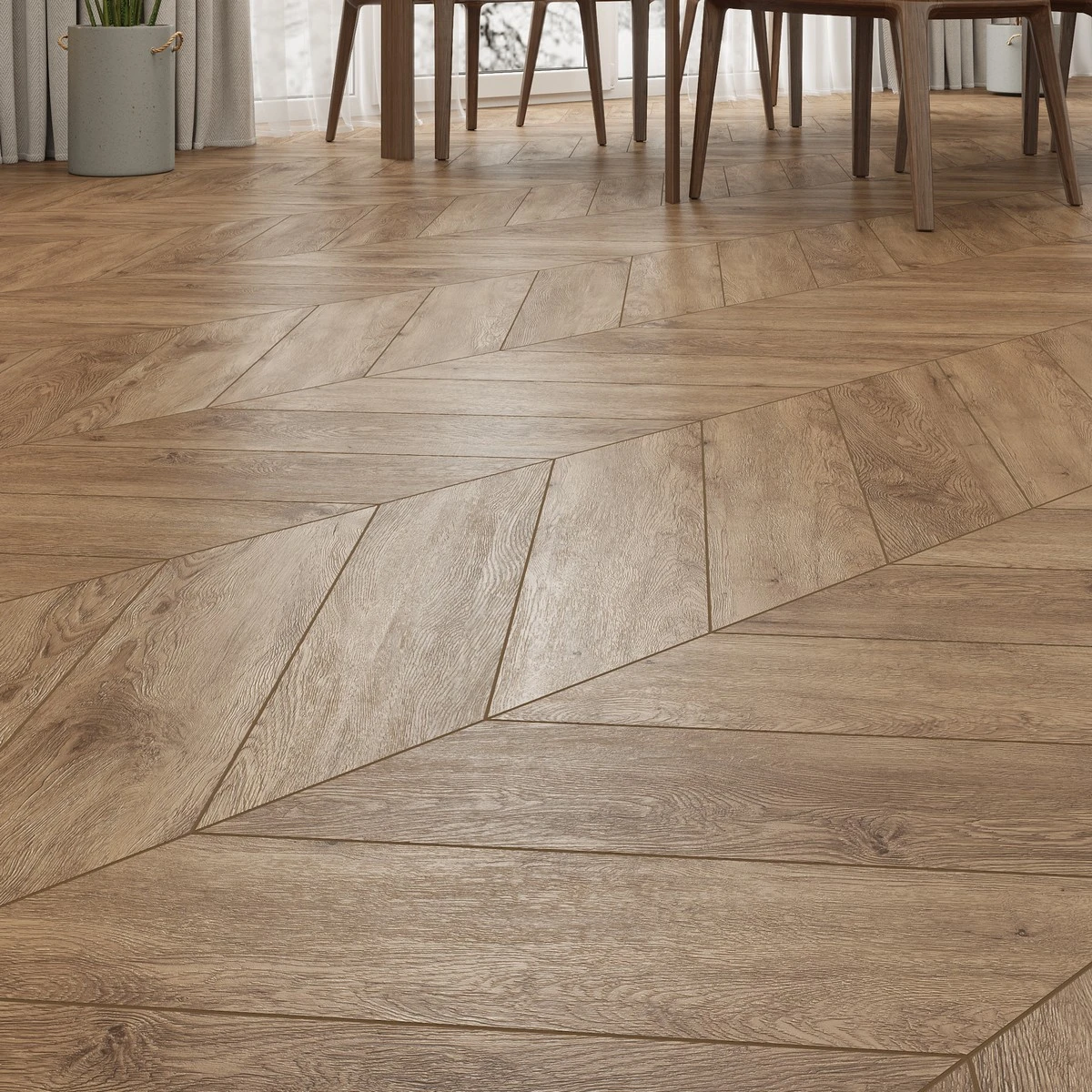С фаской 4V: срез по всем четырём краям каждой панели создаёт V-образные канавки. Это придаёт покрытию натуральный вид доски и скрывает мелкие неровности основания. Подходит для помещений с интенсивным использованием.