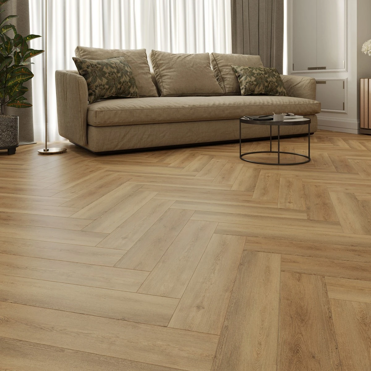 С фаской 4V: срез по всем четырём краям каждой панели создаёт V-образные канавки. Это придаёт покрытию натуральный вид доски и скрывает мелкие неровности основания. Подходит для помещений с интенсивным использованием.