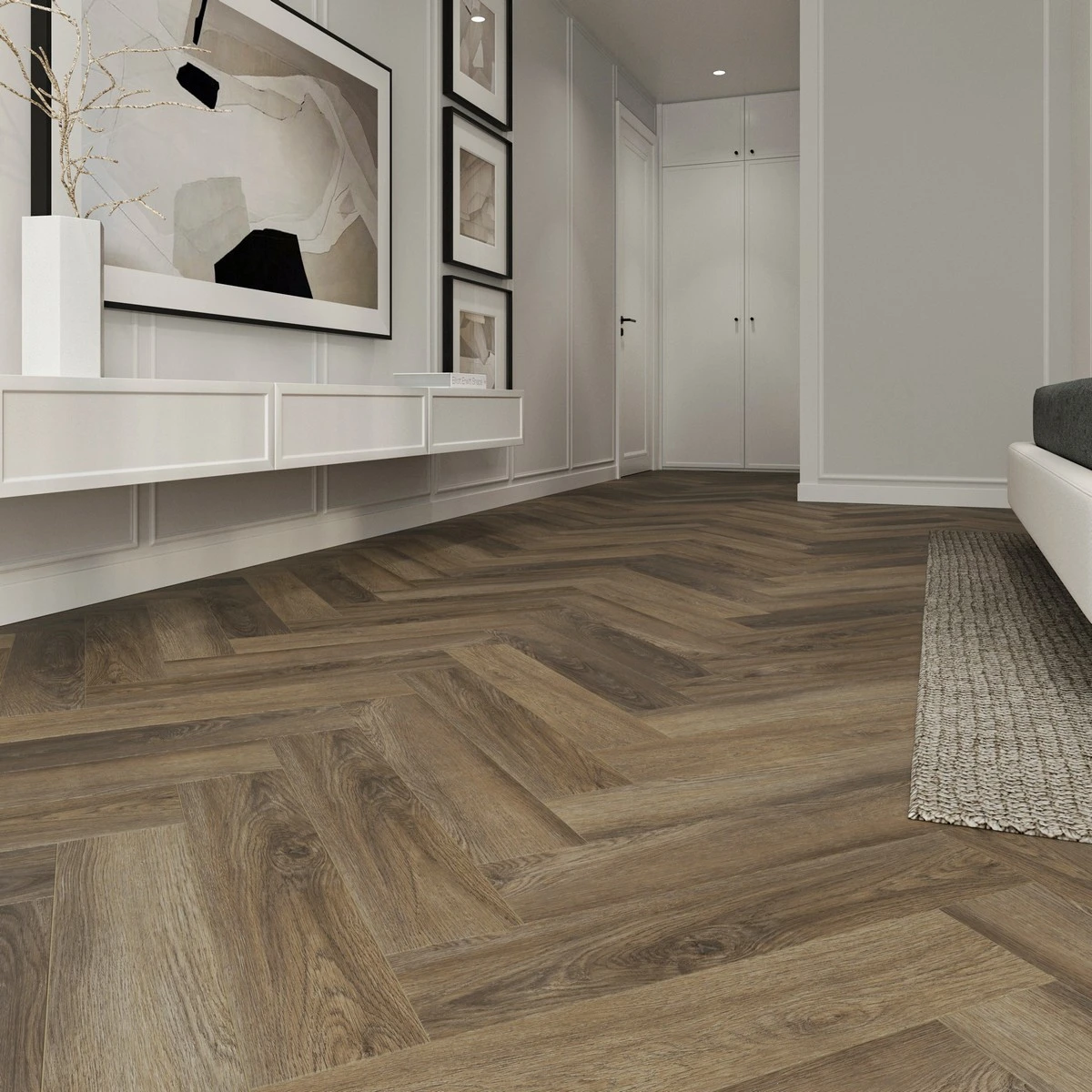 С фаской 4V: срез по всем четырём краям каждой панели создаёт V-образные канавки. Это придаёт покрытию натуральный вид доски и скрывает мелкие неровности основания. Подходит для помещений с интенсивным использованием.